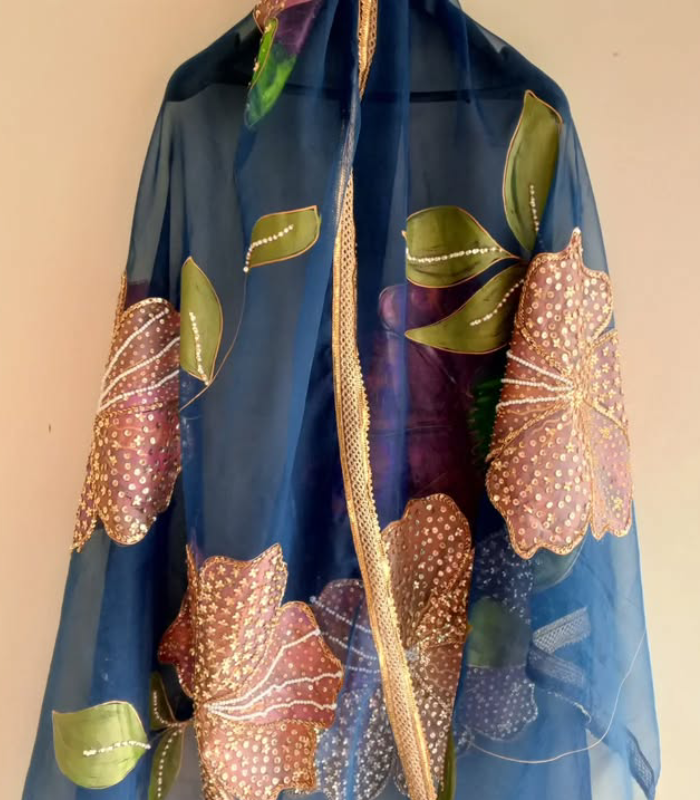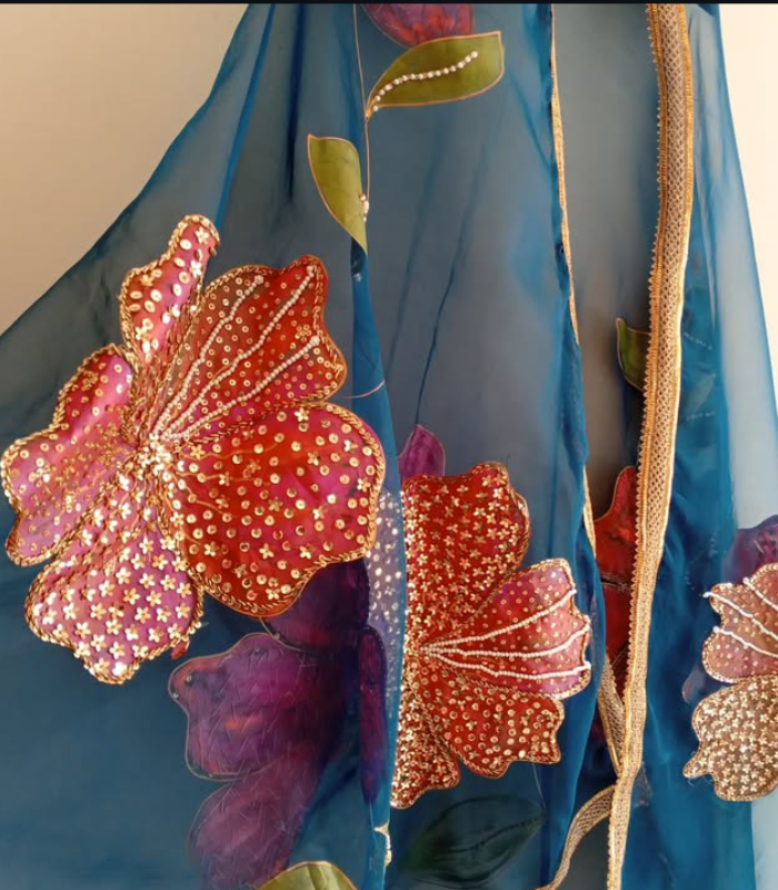 - Work: Handpainted Floral Motifs with artisanal hand-embellishments.