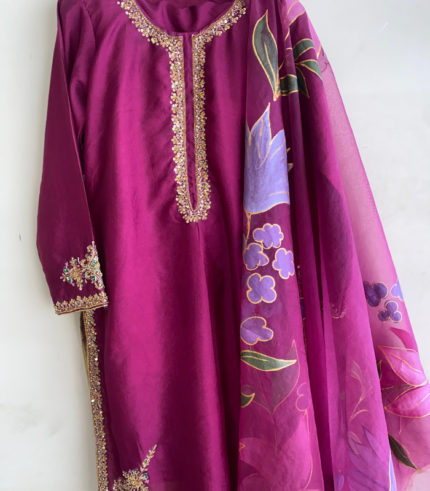 Step into timeless elegance with Aftaab, a beautiful Panelled Frock ensemble that embodies grace and handcrafted luxury, exclusively from Buruj.pk. Crafted from rich Korean Raw Silk, the kurti is accented with light golden hand embellishments for traditional charm. Paired with a sleek Cigarette Trouser and an ethereal Hand-painted Chiffon Dupatta, this suit is the epitome of sophisticated Pakistani semi-formal wear.