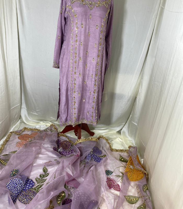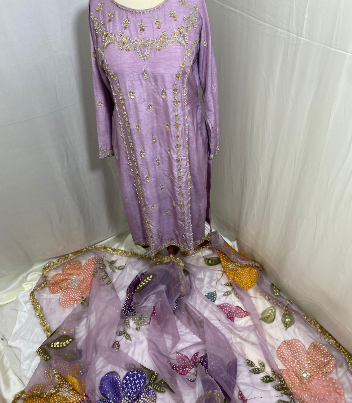 Lilac Korean Raw Silk Formal Suit with Handmade Zardozi & Handpainted Organza Dupatta