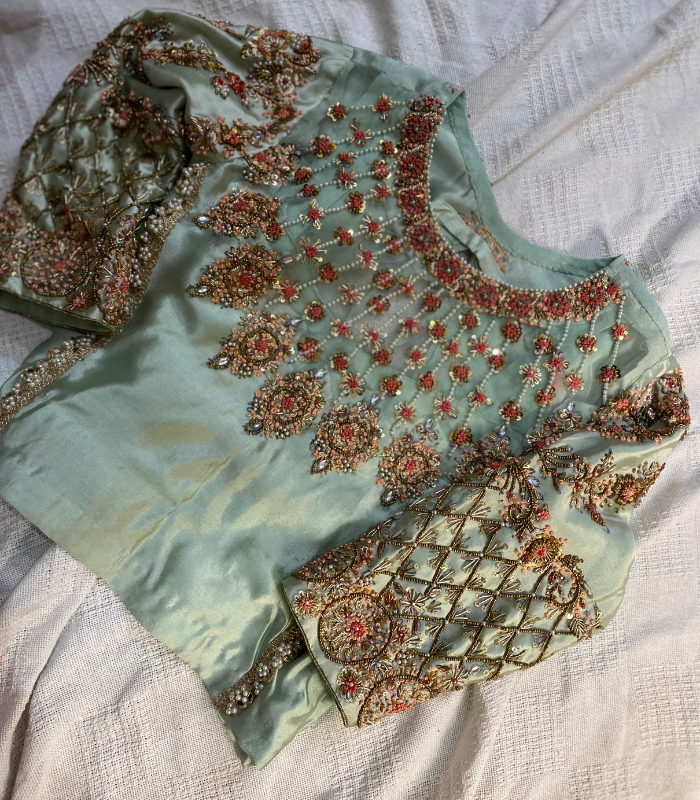 - Blouse: Heavy Zardozi and "Boor Tanka" work, with Organza Applique detail on the front and on the highly embellished back neckline.