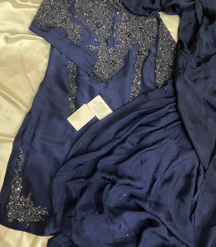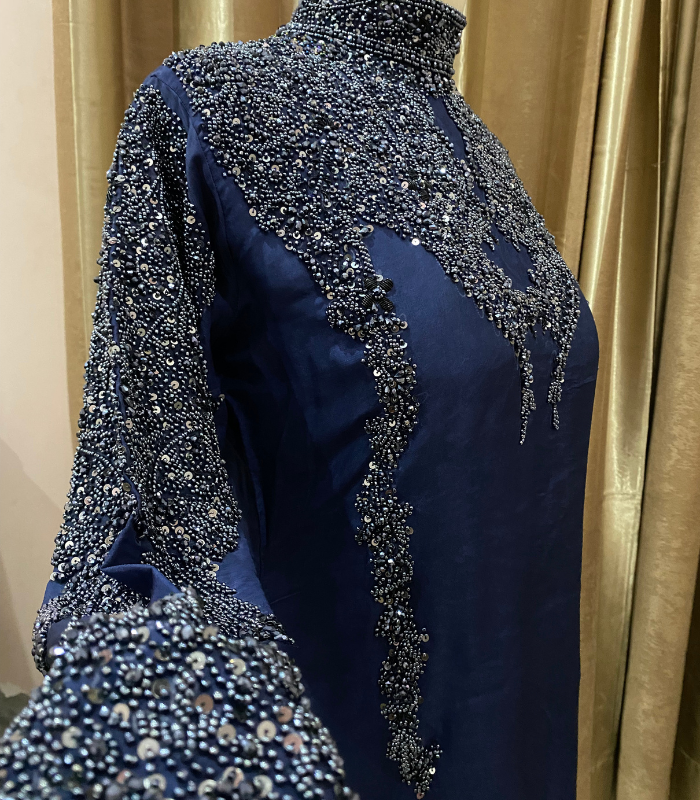 Command attention in Neelofar, a magnificent Navy Blue Formal Sharara Suit from Buruj.pk, crafted from luxurious Pure Tessal Silk. The short kameez features a sophisticated high-neck collar and is heavily hand-embellished with premium Dabka, Sequin, and Baajra Moti work for an heirloom finish. Paired with a flowing Tessal Silk Sharara and a Medium Silk dupatta with all-over sequin sprinkle, this suit is the epitome of Pakistani designer formal wear and handcrafted luxury.