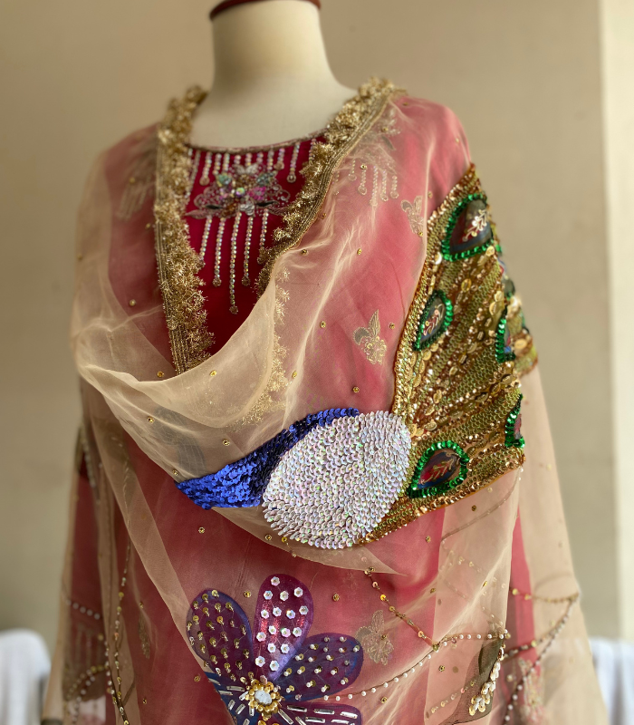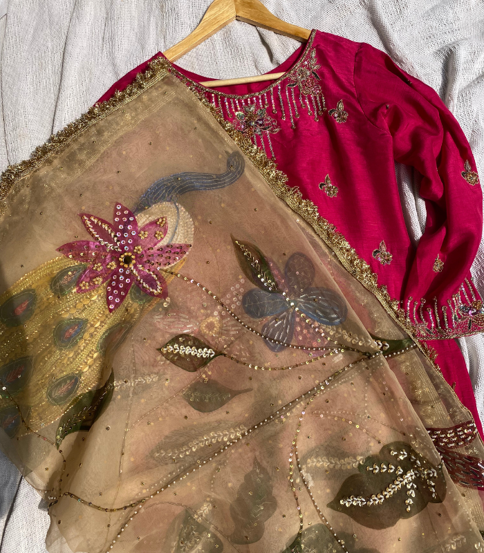 Noor-e-Bahar is the embodiment of festive grandeur, exclusively at buruj.pk. This three-piece handcrafted masterpiece features a vibrant .Shocking Pink Kurti tailored from luxurious Korean Raw Silk in a perfectly balanced, modern cut. The kurti is meticulously detailed with intricate Zardozi work and delicate hand-embellishments for an heirloom-quality finish. The ensemble is defined by its ethereal Hand-painted Organza Dupatta, showcasing bespoke peacock and bird motifs enhanced with sequin work, which offers a striking visual contrast. Paired with matching Flared Trousers, this suit delivers effortless refinement and is the perfect statement of high-end Pakistani formal wear and sustainable luxury.